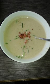 Vul nu de kommen met soep, doe wat spekjes boven op de soep en wat fijn gesneden bieslook. Bak eventueel een stokbroodje in de oven. Voor koemelk en Lactose vrij kun je de afbak broodjes kopen van AH Euroshopper.