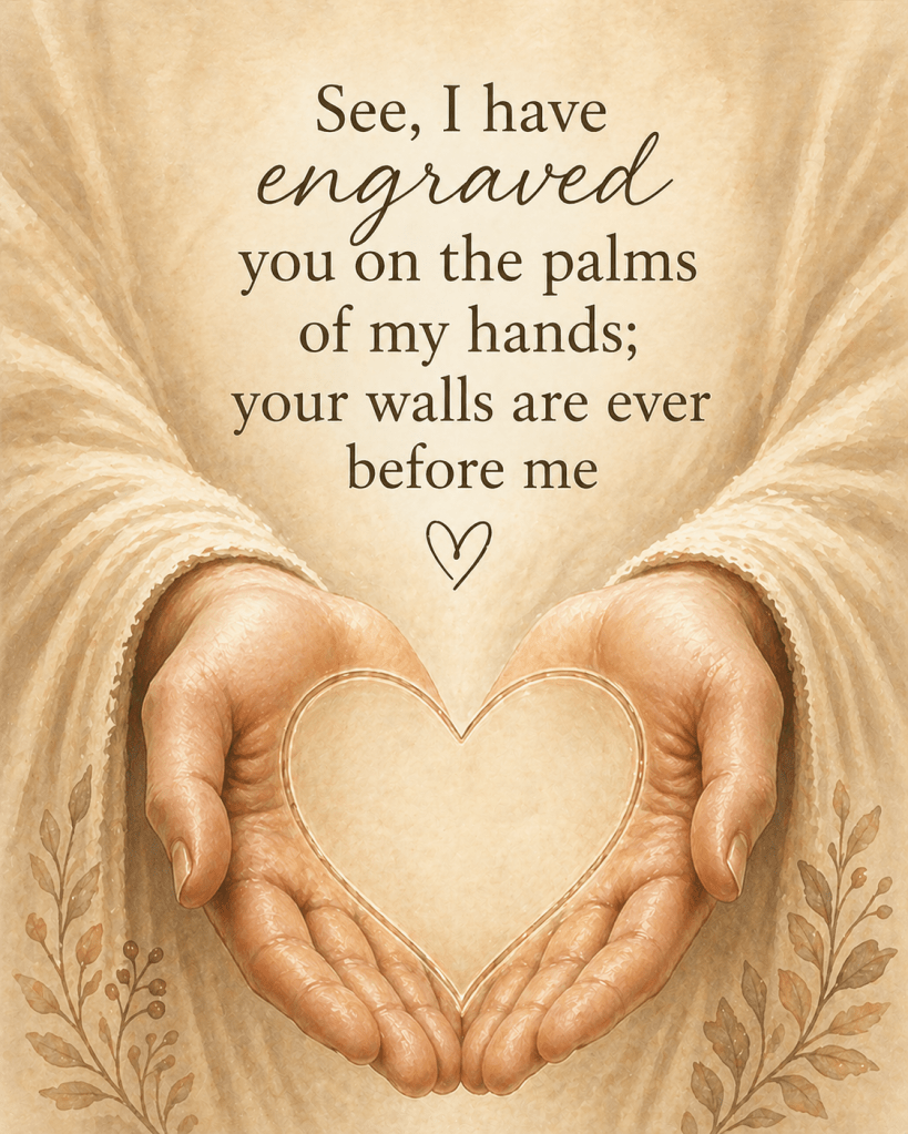 Een mooie tekst die je geborgen weet in Gods handen. Maar ook hen die je lief zijn. Wat er ook gebeurd je naam staat gegrift in Gods handen. Daar kun je dus nooit meer uitvallen.